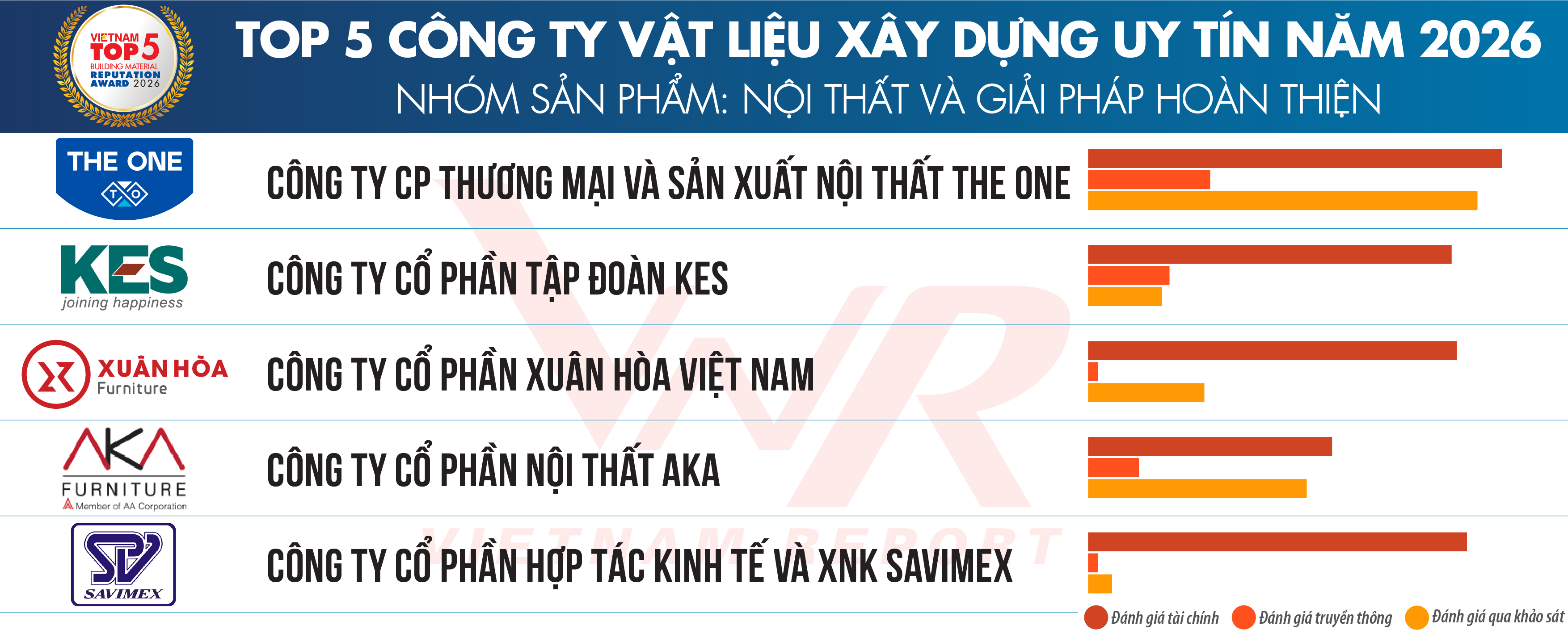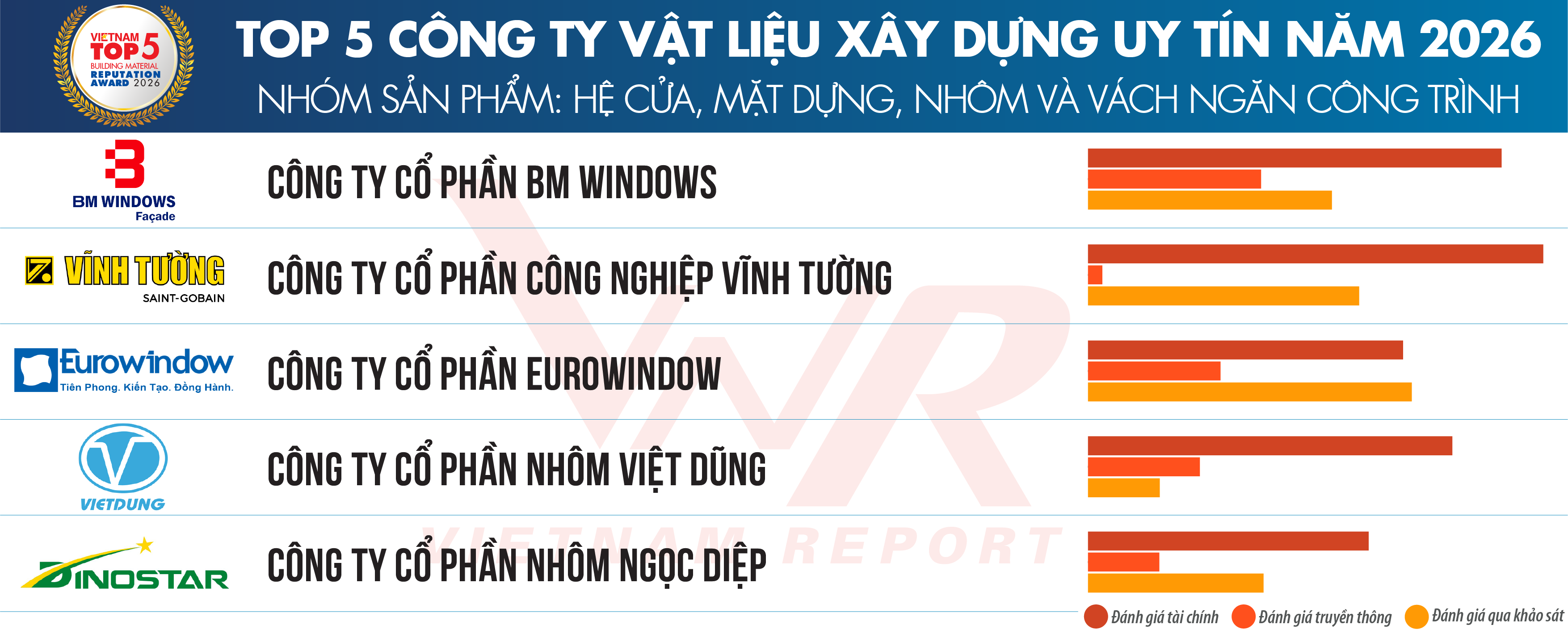 Ngày 01/4/2026, Công ty Cổ phần Báo cáo Đánh giá Việt Nam (Vietnam Report) chính thức công bố Top 10 & Top 5 Công ty Vật liệu xây dựng uy tín năm 2026. Lễ công bố và vinh danh các doanh nghiệp tiêu biểu sẽ được tổ chức vào tháng 4/2026 tại TP. Hồ Chí Minh.