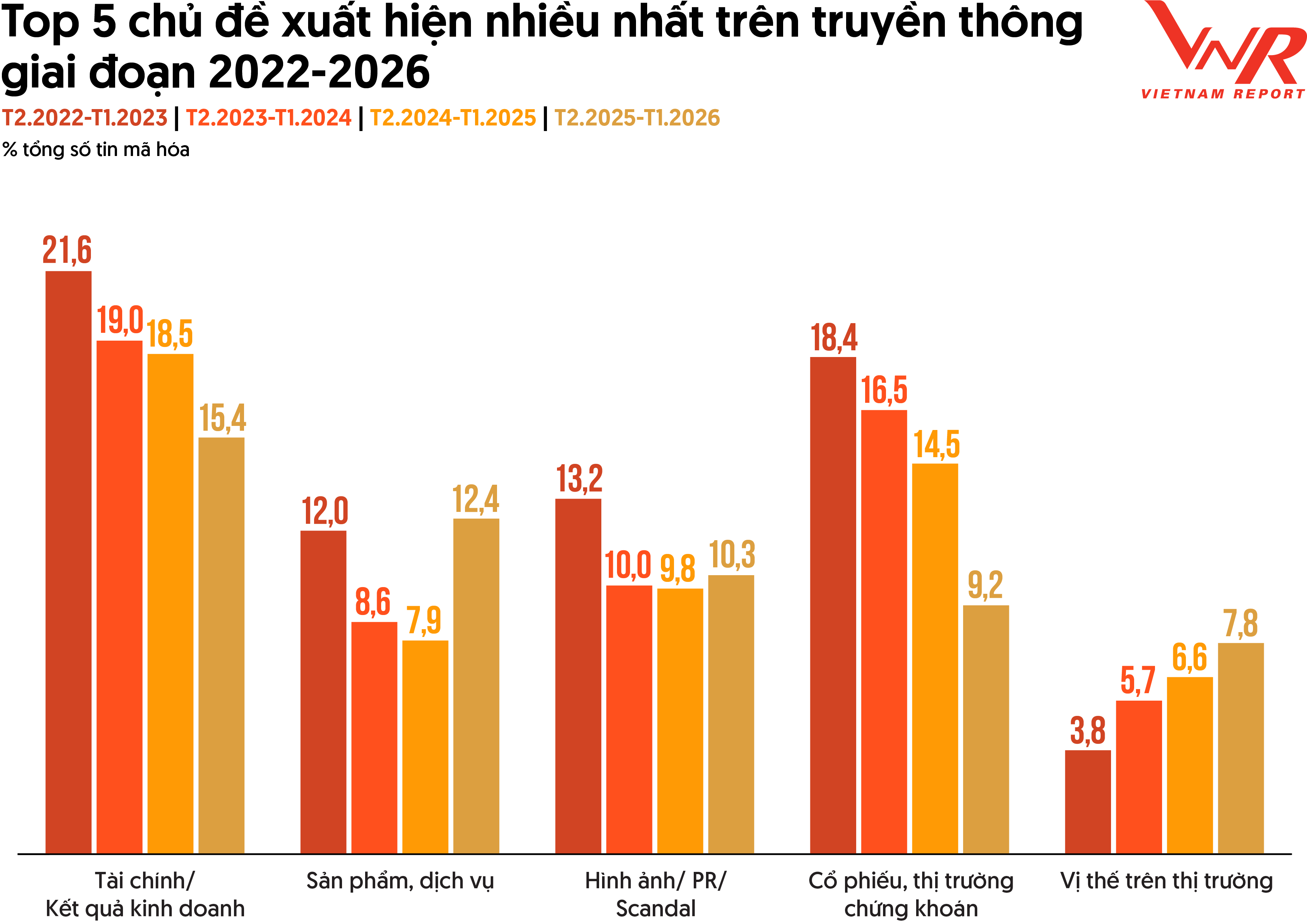 Nếu giai đoạn đầu truyền thông ngành VLXD được chi phối bởi những con số lợi nhuận và biến động cổ phiếu, thì những năm gần đây cho thấy một sự dịch chuyển rõ rệt trong trọng tâm nội dung. Truyền thông không chỉ dừng lại ở việc phản ánh kết quả kinh doanh hay diễn biến thị trường vốn, mà đang chuyển sang những câu chuyện mang tính chiến lược dài hạn của doanh nghiệp. Xu hướng này thể hiện rõ qua sự suy giảm dần của các tin bài liên quan đến tài chính và thị trường chứng khoán. Cụ thể, tỷ trọng nội dung về tài chính/kết quả kinh doanh giảm từ 21,6% xuống còn 15,4% trong giai đoạn 2022-2026, trong khi chủ đề cổ phiếu và thị trường chứng khoán cũng giảm mạnh từ 18,4% xuống 9,2%. Điều này cho thấy truyền thông đang dần rời khỏi góc nhìn ngắn hạn xoay quanh lợi nhuận, dòng tiền hay biến động giá cổ phiếu, để nhường chỗ cho những câu chuyện phản ánh năng lực cạnh tranh và định hướng phát triển dài hạn của doanh nghiệp.