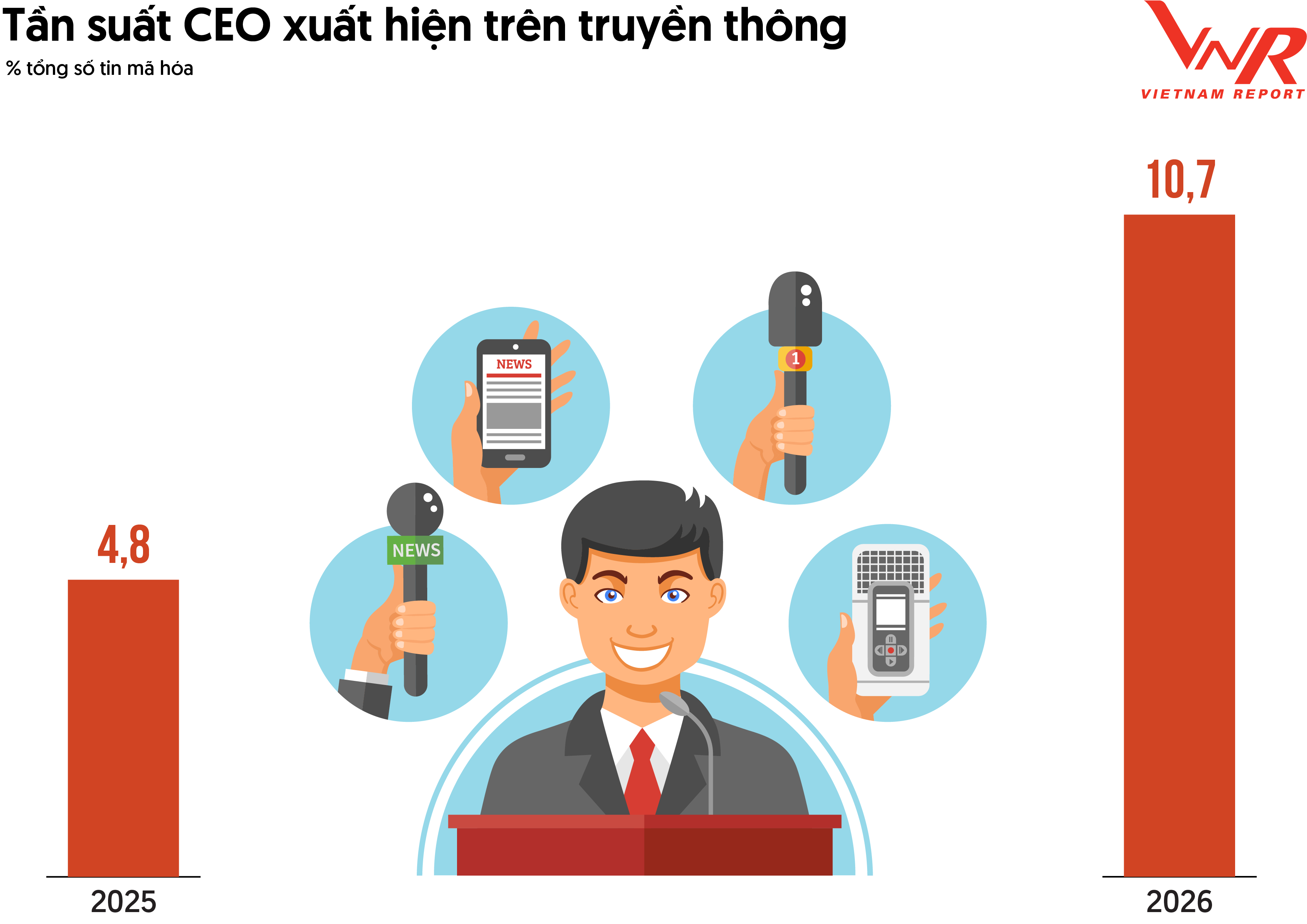 Sự dịch chuyển trong trọng tâm nội dung truyền thông cũng kéo theo sự thay đổi trong cách doanh nghiệp sử dụng hình ảnh lãnh đạo trên truyền thông, đặc biệt là vai trò của CEO như một đại diện cho tầm nhìn và chiến lược doanh nghiệp. Dữ liệu cho thấy tần suất CEO xuất hiện trên truyền thông có xu hướng gia tăng đáng kể trong giai đoạn gần đây. Cụ thể, tỷ lệ tin bài có sự xuất hiện hoặc trích dẫn phát biểu của CEO tăng từ 4,8% trong năm 2025 lên 10,7% trong năm 2026, tức tăng hơn gấp đôi chỉ trong một năm.