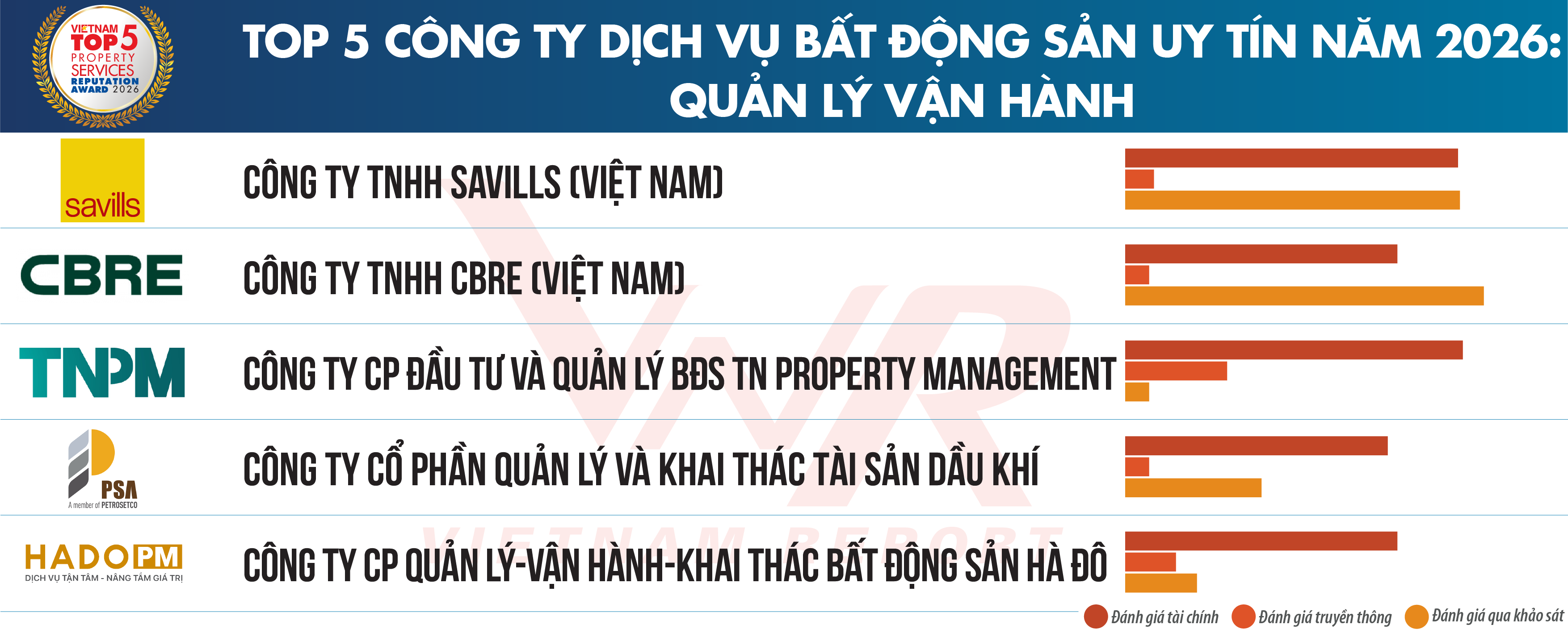 Ngày 19/3/2026, Công ty Cổ phần Báo cáo Đánh giá Việt Nam (Vietnam Report) chính thức công bố Top 10 & Top 5 Công ty uy tín ngành Bất động sản năm 2026. Lễ tôn vinh các doanh nghiệp tiêu biểu sẽ diễn ra vào tháng 4/2026 tại TP. Hồ Chí Minh.