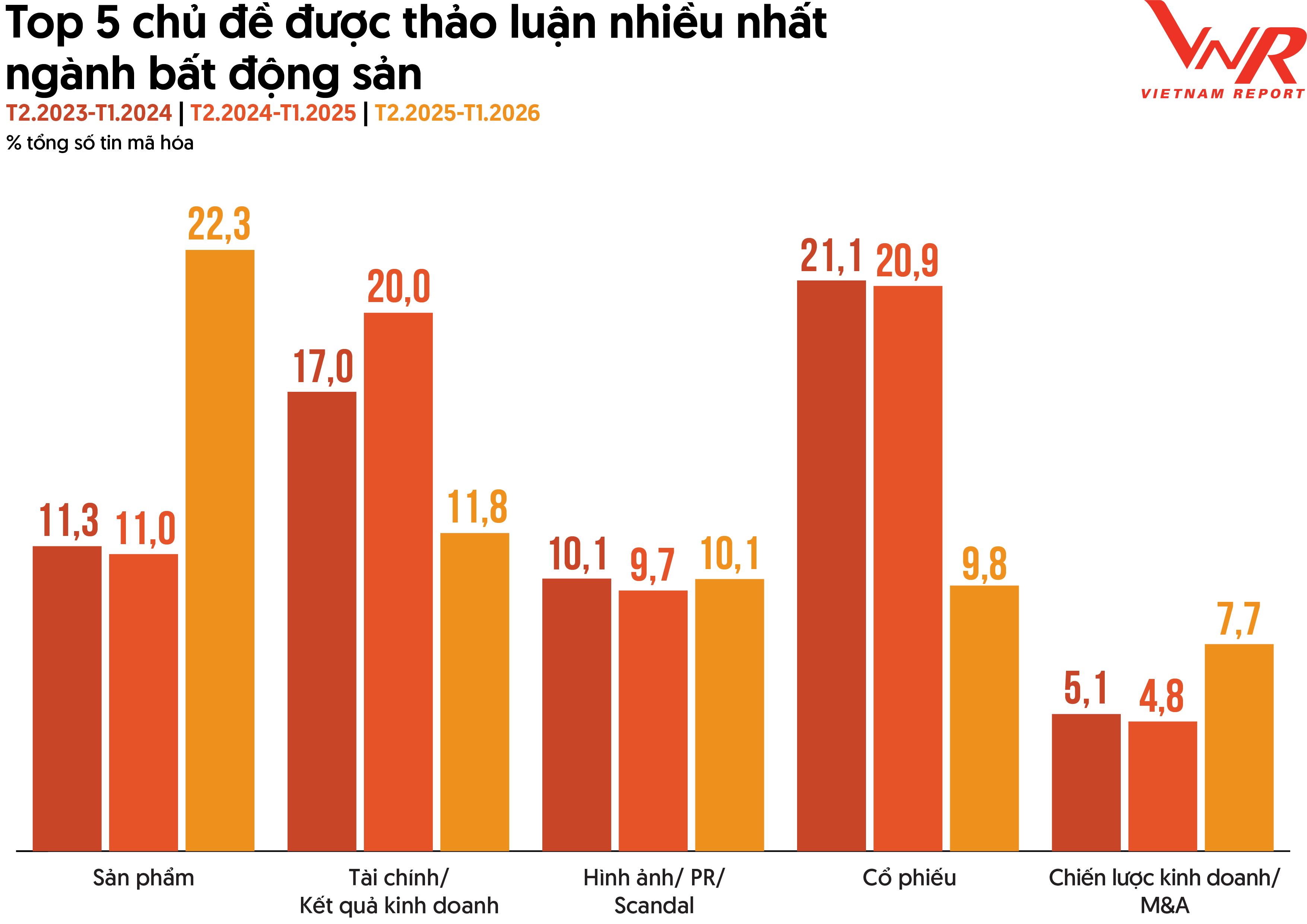 Dữ liệu phân tích Media Coding trong giai đoạn từ tháng 2/2025 đến tháng 1/2026 của Vietnam Report cho thấy 5 nhóm chủ đề được đề cập nhiều nhất trên truyền thông của các doanh nghiệp bất động sản trong nghiên cứu bao gồm: (1) Sản phẩm, (2) Tài chính/Kết quả kinh doanh, (3) Hình ảnh/PR/Scandals, (4) Cổ phiếu và (5) Chiến lược kinh doanh/ M&A. Trong đó, các nội dung liên quan đến sản phẩm và dự án ghi nhận sự gia tăng đáng kể, chiếm 22,3% tổng lượng thảo luận – mức cao nhất trong ba giai đoạn khảo sát. Điều này phản ánh sự quan tâm của truyền thông đối với các hoạt động mở bán, triển khai dự án và nguồn cung mới khi thị trường dần có dấu hiệu phục hồi. Trong khi đó, các chủ đề về hình ảnh/PR/Scandals duy trì tỷ trọng tương đối ổn định quanh mức 10%, còn chiến lược kinh doanh/M&A tuy chiếm tỷ trọng nhỏ hơn nhưng có xu hướng tăng lên, đạt 7,7% trong giai đoạn gần nhất, phản ánh sự quan tâm ngày càng lớn đến các hoạt động tái cấu trúc và mở rộng chiến lược của doanh nghiệp trong bối cảnh thị trường bước vào giai đoạn sàng lọc và tái định hình. Ngược lại, nhóm chủ đề tài chính/kết quả kinh doanh và cổ phiếu có xu hướng giảm tỷ trọng.